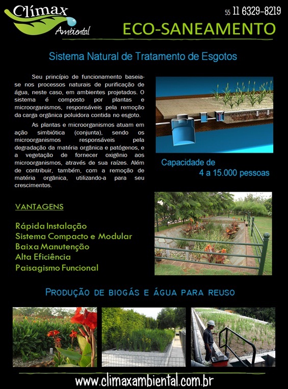 Sistema de Tratamento Natural de Esgoto. Através de plantas e microorganismos promovemos o tratamento do esgoto, permitindo o reuso da água tratada. Sub-produtos do tratamento do esgoto: Produção de Água de Reuso Produção de BiogásProdução de mudas ornamentais Ideal para: casas, sítios, hotéis, pousadas, empresas, fábricas, escolas, etc.